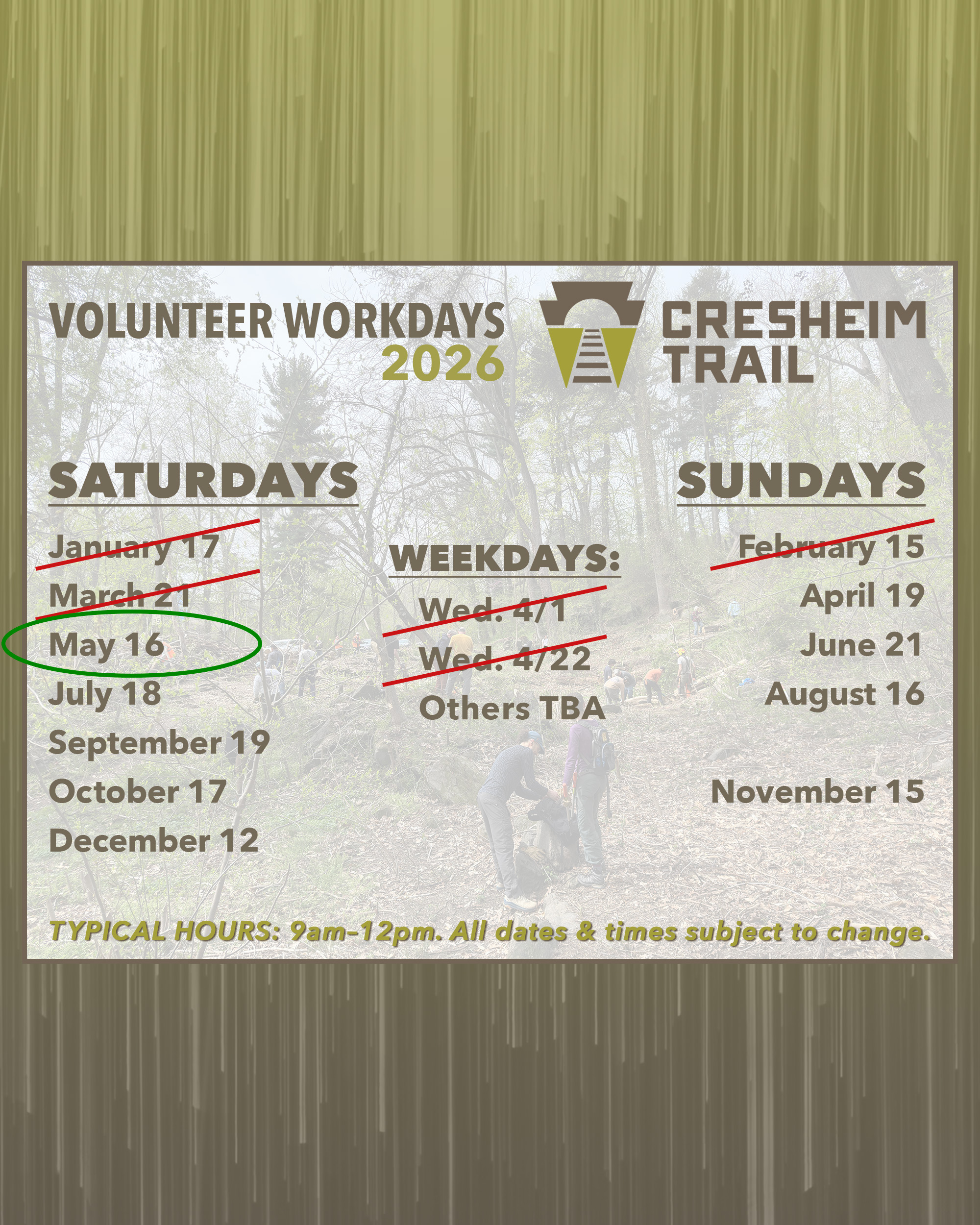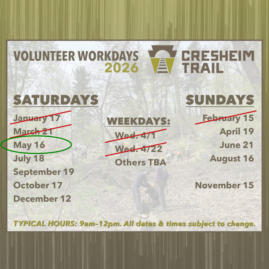 PLEASE NOTE: Dates are subject to change. Also, we will announce weekday outings as they become available. Follow our social media channels (Instagram and Facebook @cresheimtrail) for the most up-to-date information.