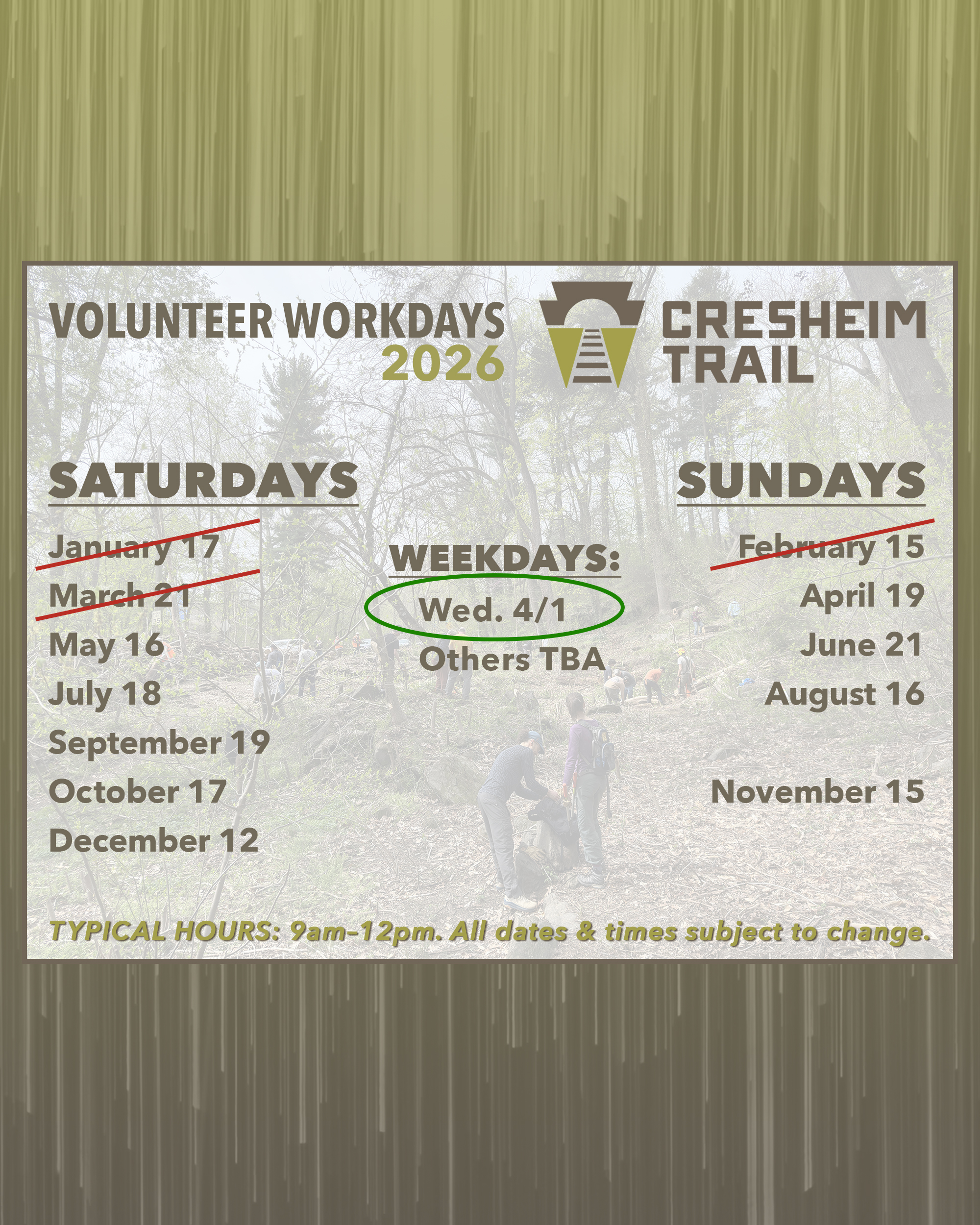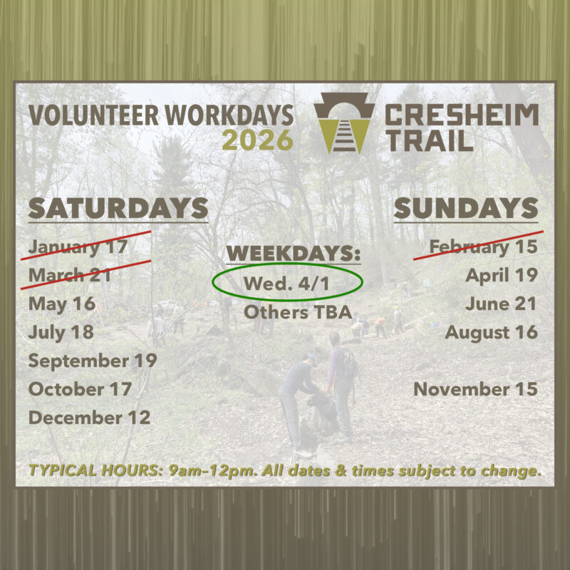 PLEASE NOTE: Dates are subject to change. Also, we will announce weekday outings as they become available. Follow our social media channels (Instagram and Facebook @cresheimtrail) for the most up-to-date information.